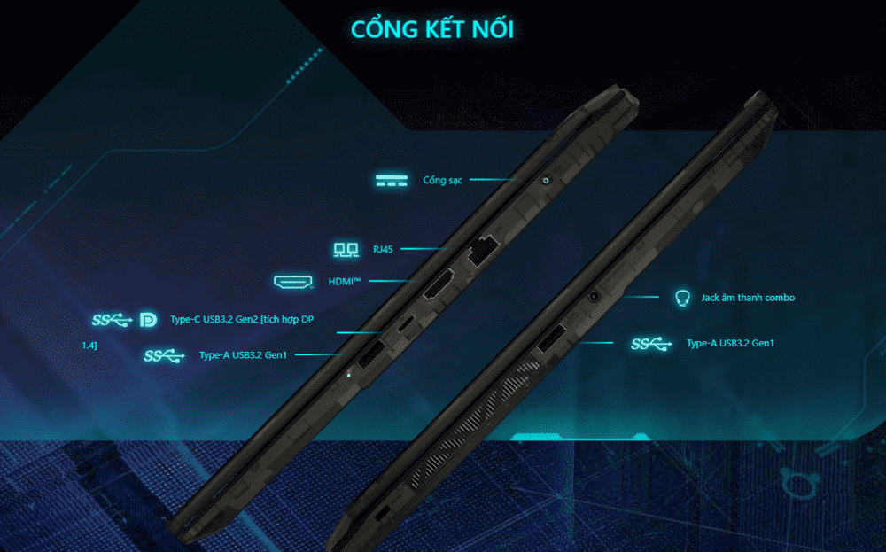 - Cạnh phải: Bao gồm 1 x cổng DC-in (sạc), 1 x cổng LAN RJ45 Gigabit để kết nối mạng có dây tốc độ cao, 1 x cổng HDMI để kết nối với màn hình ngoại vi, 1 x cổng USB Type-C hỗ trợ DisplayPort, và 1 x cổng USB 3.2 tốc độ cao khác. Đây là sự kết hợp đa dạng giữa các cổng kết nối, cho phép bạn linh hoạt kết nối với nhiều loại thiết bị và trải nghiệm các tác vụ đa dạng một cách tiện lợi.
