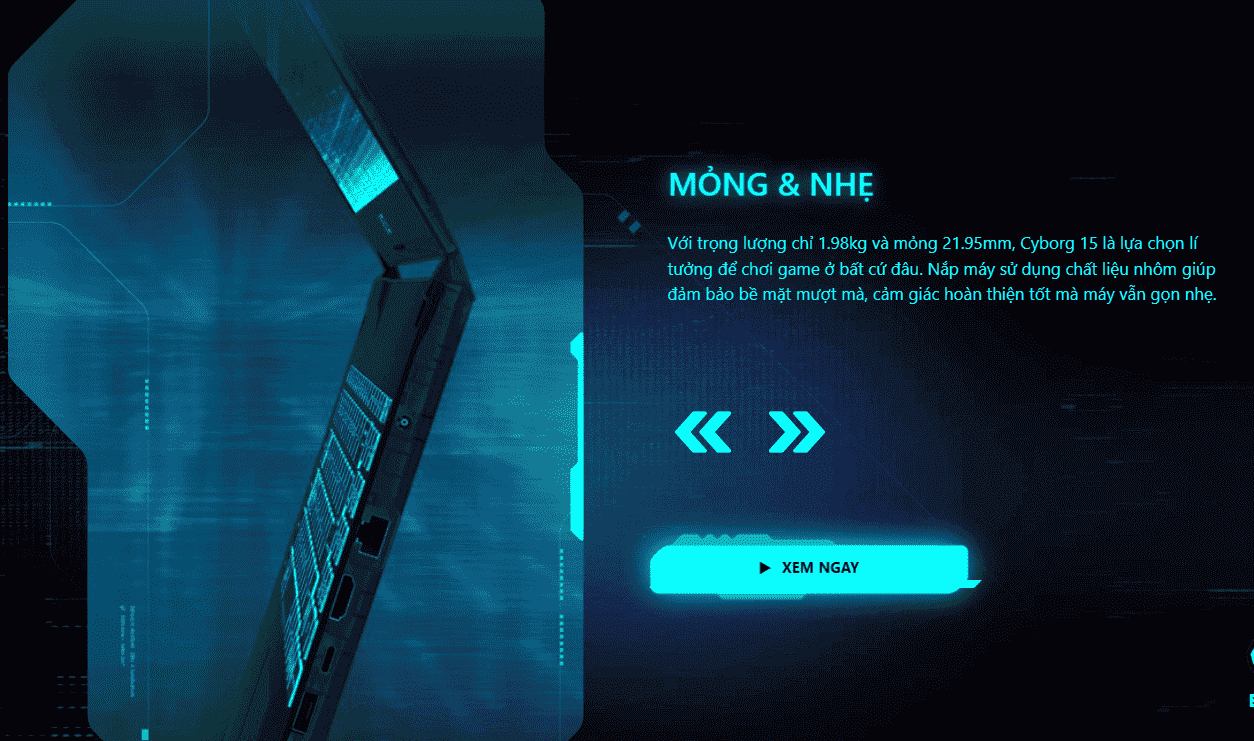 - MSI Cyborg 15 được lấy nhiều cảm hứng từ Blade Runner và Dune. Trong đó, "C15" là nhân vật biểu trưng cho tinh thần của Cyborg 15: thon gọn, đậm chất Gaming và sức mạnh đáng nể, phần trong suốt trên bàn phím. Vỏ máy cho phép nhìn xuyên thấu vào các linh kiện bên trong và những đường viền đậm chất máy móc cùng ngôn ngữ thiết kế nhất quán. Cyborg 15 đang tái hiện lại phong cách của tương lai.