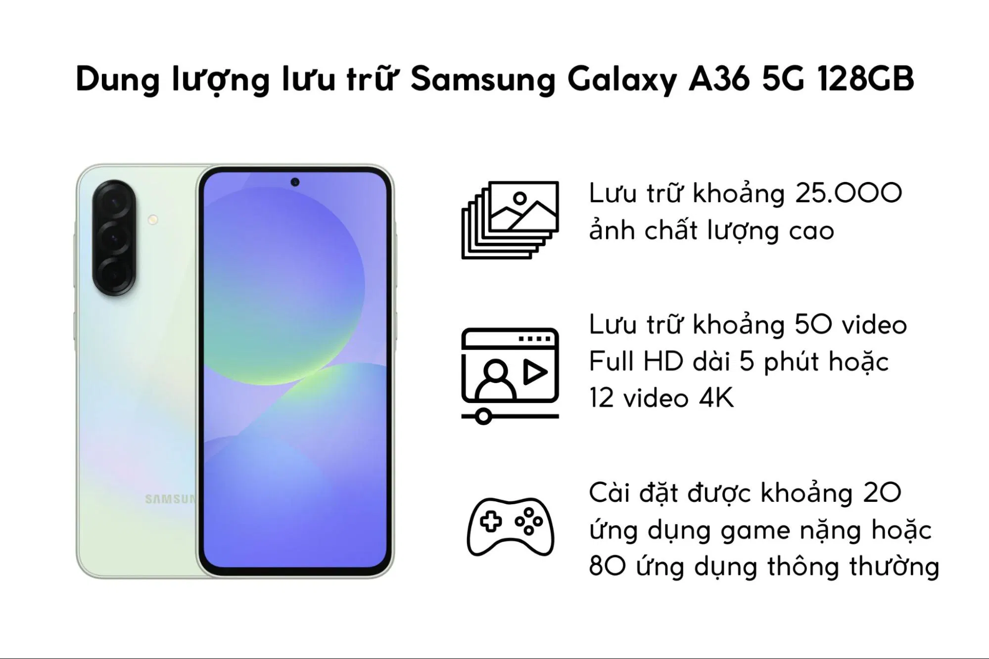 Dung lượng 128GB của Galaxy A36 5G cung cấp không gian lưu trữ rộng rãi cho nhu cầu sử dụng đa dạng của người dùng hiện đại.