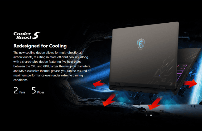 - Một trong những điểm mạnh của MSI Crosshair 16 chính là hệ thống tản nhiệt Cooler Boost 5. Được thiết kế lại với 2 quạt và 5 ống dẫn nhiệt tối ưu hóa khả năng làm mát, giữ cho máy luôn mát mẻ và ổn định đặc biệt là khi chơi game 3D, livestream, hoặc render video.