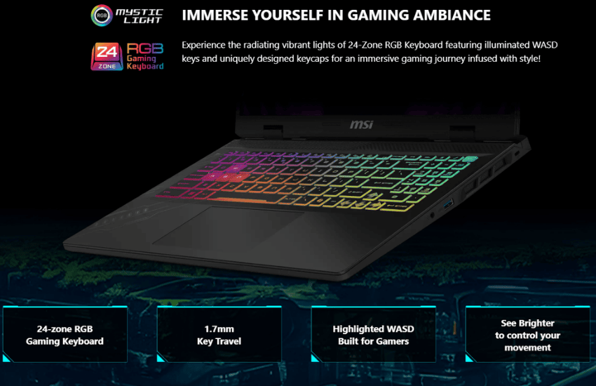 - Đặc biệt, các phím WASD được làm nổi bật bằng ánh sáng RGB, nhờ đó game thủ sẽ dễ dàng nhận diện và thao tác chính xác trong những trận chiến căng thẳng. Với hành trình phím 1.7mm, Crosshair 16 HX AI mang đến cảm giác gõ thoải mái, đồng thời còn nâng cao độ chính xác trong mỗi lần nhấn phím. Khi gõ, bạn sẽ cảm nhận được sự phản hồi rõ ràng, không bị cảm giác “lún” hay “mềm” khó chịu, giúp bạn dễ dàng nắm bắt được từng nhịp gõ.