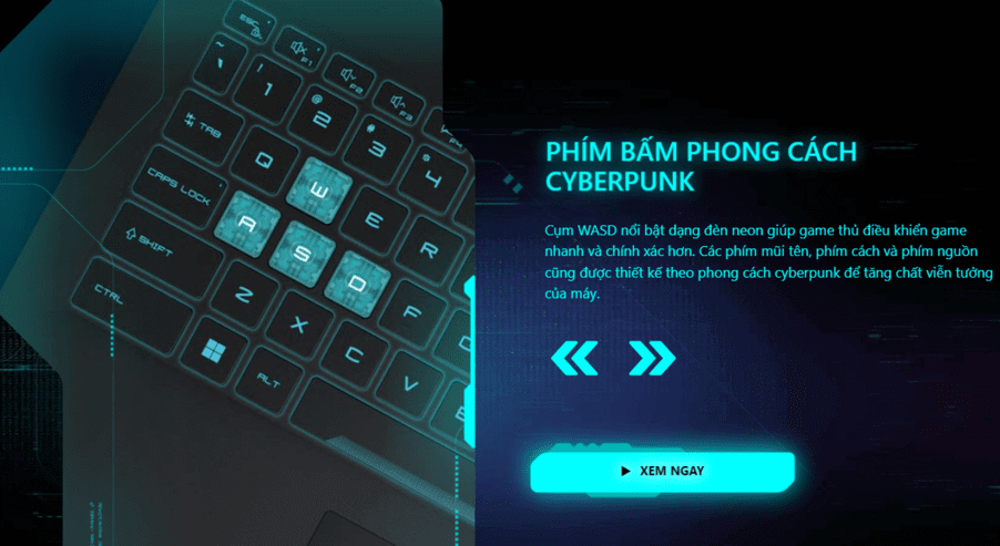 - Ngoài ra, cảm giác công nghệ tương lai và viễn tưởng được thể hiện qua thiết kế của các phím mũi tên, phím cách và phím nguồn, mang đến một không gian cyberpunk độc đáo cho chiếc laptop. Điều này không chỉ làm tôn lên cái nhìn hiện đại mà còn thể hiện sự đổi mới và tương lai trong thiết kế của MSI Cyborg 15.
