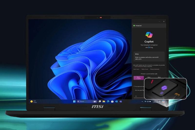 Ngoài ra, MSI còn tích hợp sẵn phím tắt kích hoạt Copilot nhằm hỗ trợ truy cập nhanh vào trợ lý ảo của Windows 11, giúp rút ngắn thao tác và nâng cao hiệu quả sử dụng. Touchpad có diện tích đủ lớn, hỗ trợ cảm ứng đa điểm thuận tiện trong những tình huống cần làm việc cơ động mà không có chuột rời.