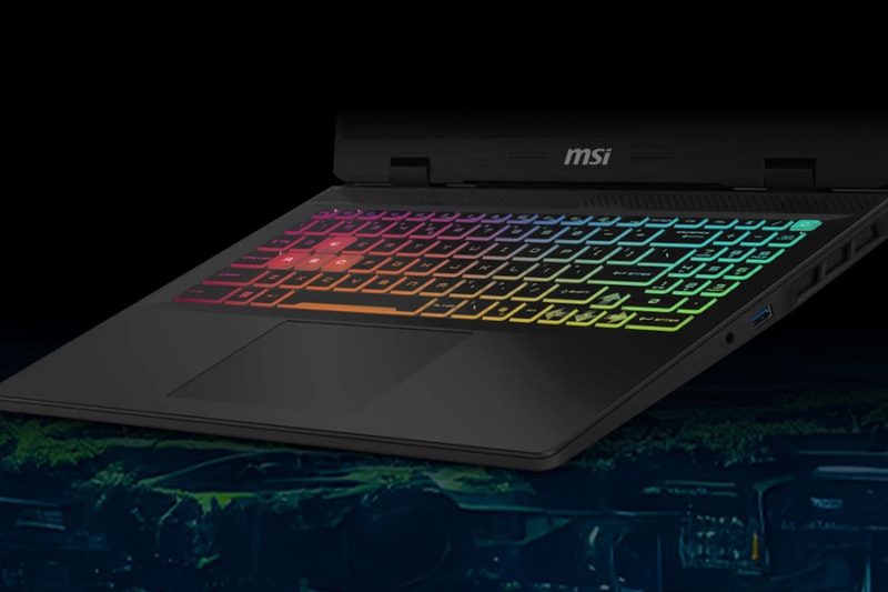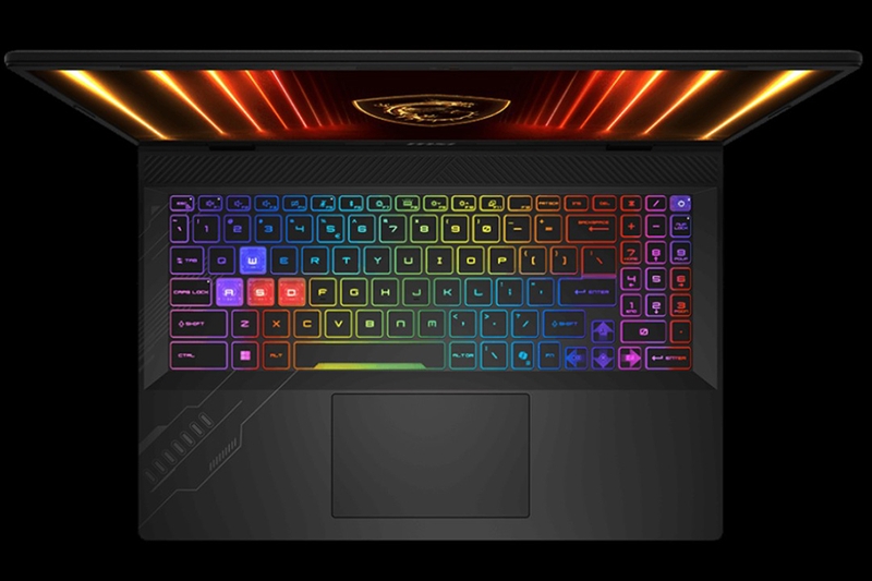 MSI tích hợp bàn phím gaming với đèn nền RGB chia thành 24 vùng tùy chỉnh độc lập, phù hợp cho nhu cầu cá nhân hóa không gian làm việc hoặc đồng bộ với các hiệu ứng trong game. Cụm phím WASD được thiết kế nổi bật bằng vật liệu trong suốt giúp dễ định vị trong điều kiện thiếu sáng.