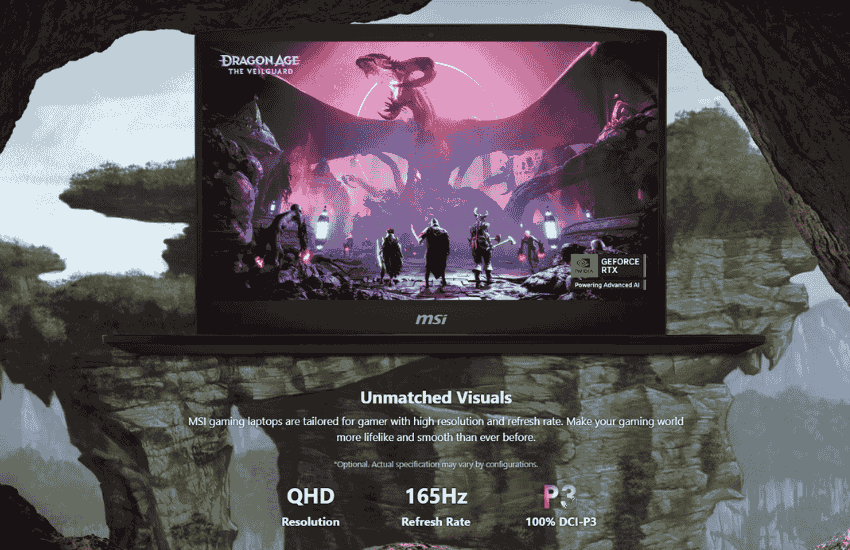 - Màn hình kích thước 15.6-inch với độ phân giải QHD 2K5 (2560*1440) pixels, sử dụng tấm nền IPS chất lượng cao cho góc nhìn rộng và hình ảnh sắc nét. Với tần số quét 165Hz, chiếc laptop này mang đến trải nghiệm hình ảnh cực kỳ mượt màcho các game thủ chơi các tựa game hành động nhanh, bắn súng góc nhìn thứ nhất hoặc thể thao điện tử như Valorant, CS:GO hay Apex Legends. Chuyển động trên màn hình được tái hiện mịn màng, không xé hình, không giật lag giúp cho mọi chiến đấu đều được thể hiện trọn vẹn.