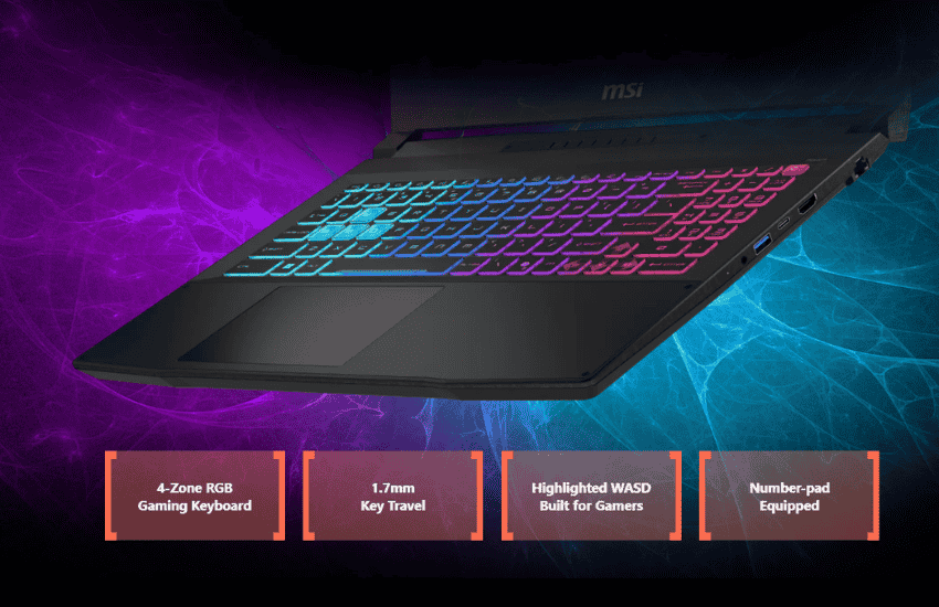 - Máy được trang bị bàn phím Keyboard RGB 4 Zone có thể điều chỉnh màu sắc theo sở thích hoặc theo chủ đề game. Ánh sáng đèn nền dịu mắt, tỏa đều và đẹp mắt trong môi trường thiếu sáng, giúp bạn không bị mất phương hướng ngay cả khi chiến game đêm khuya.