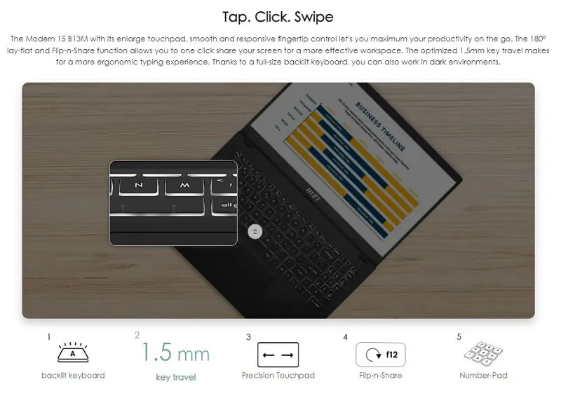 - Modern 15 còn nổi bật với tính năng màn hình góc mở 180° và Flip-Share, mang đến sự tiện ích và linh hoạt trong việc chia sẻ thông tin. Bạn có thể chia sẻ màn hình với người đối diện chỉ bằng một cú ấn F12, giúp tiết kiệm thời gian và tăng cường sự tương tác trong các cuộc họp hay trình diễn.