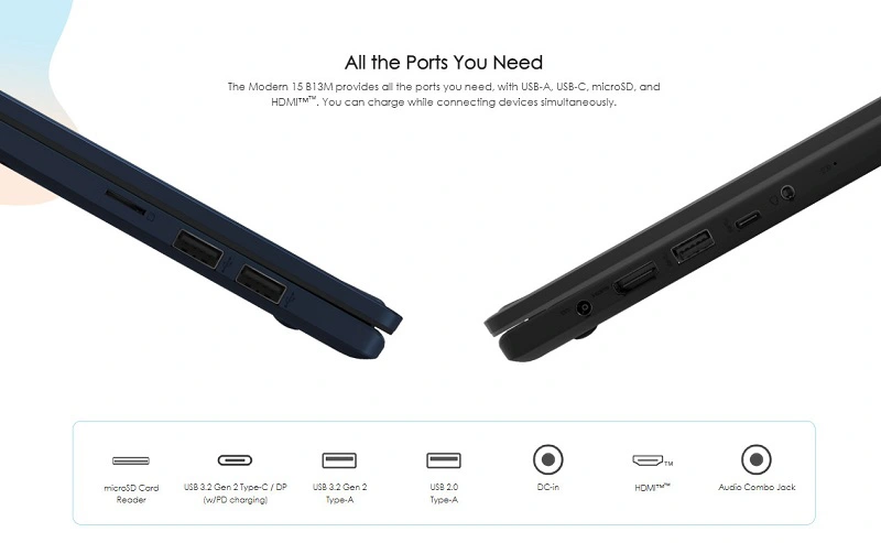 - Với nhiều đa dạng cổng kết nối, MSI Modern 15 có thể giúp bạn dễ dàng kết nối với nhiều thiết bị khác nhau và tận dụng tối đa tiềm năng của chiếc laptop này. Đa dạng các cổng kết nối như USB-A, USB-C, microSD và HDMI cho phép bạn linh hoạt trong việc truyền tải dữ liệu, kết nối màn hình ngoại vi, hoặc sạc máy trong khi làm việc.