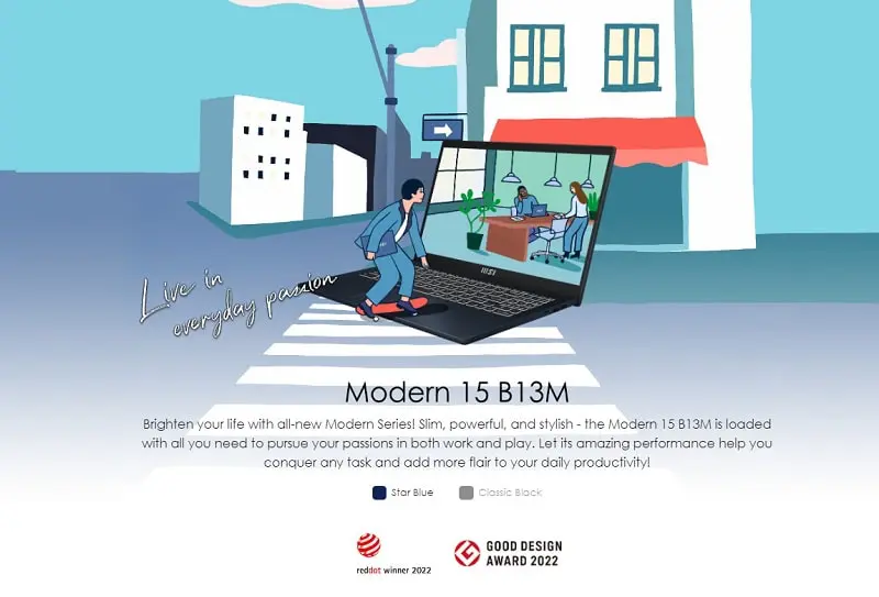 - Không chỉ tập trung vào hiệu năng và tính di động, MSI còn đặc biệt chú trọng đến yếu tố thẩm mỹ. MSI Modern 15 mang đến các tùy chọn phong cách riêng biệt với các màu sắc độc đáo. Nếu bạn yêu thích sự bí ẩn và truyền thống, màu đen (Classic Black) là lựa chọn hoàn hảo. Còn nếu bạn muốn tự do thăng hoa và bay cao như bầu trời đêm, màu xanh (Star Blue) chắc chắn sẽ làm hài lòng mọi đam mê.
