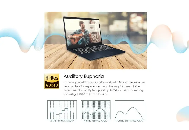- Modern 15 H C2RMG không chỉ giới hạn ở hiệu năng và tính tiện ích, mà còn mang đến cho bạn những trải nghiệm âm thanh đỉnh cao. Tận hưởng những khoảnh khắc tuyệt vời khi nghe nhạc với chất lượng âm thanh tuyệt hảo nhờ hỗ trợ lấy mẫu âm thanh lên đến 24bit / 192kHz. Điều này cho phép bạn lắng nghe âm nhạc chân thực và sống động như chưa từng có trước đây. Mỗi âm thanh, từ nhịp điệu đến giọng ca, đều được tái hiện chính xác và chất lượng cao, đem lại cảm giác như đang trực tiếp thưởng thức biểu diễn trên sân khấu.