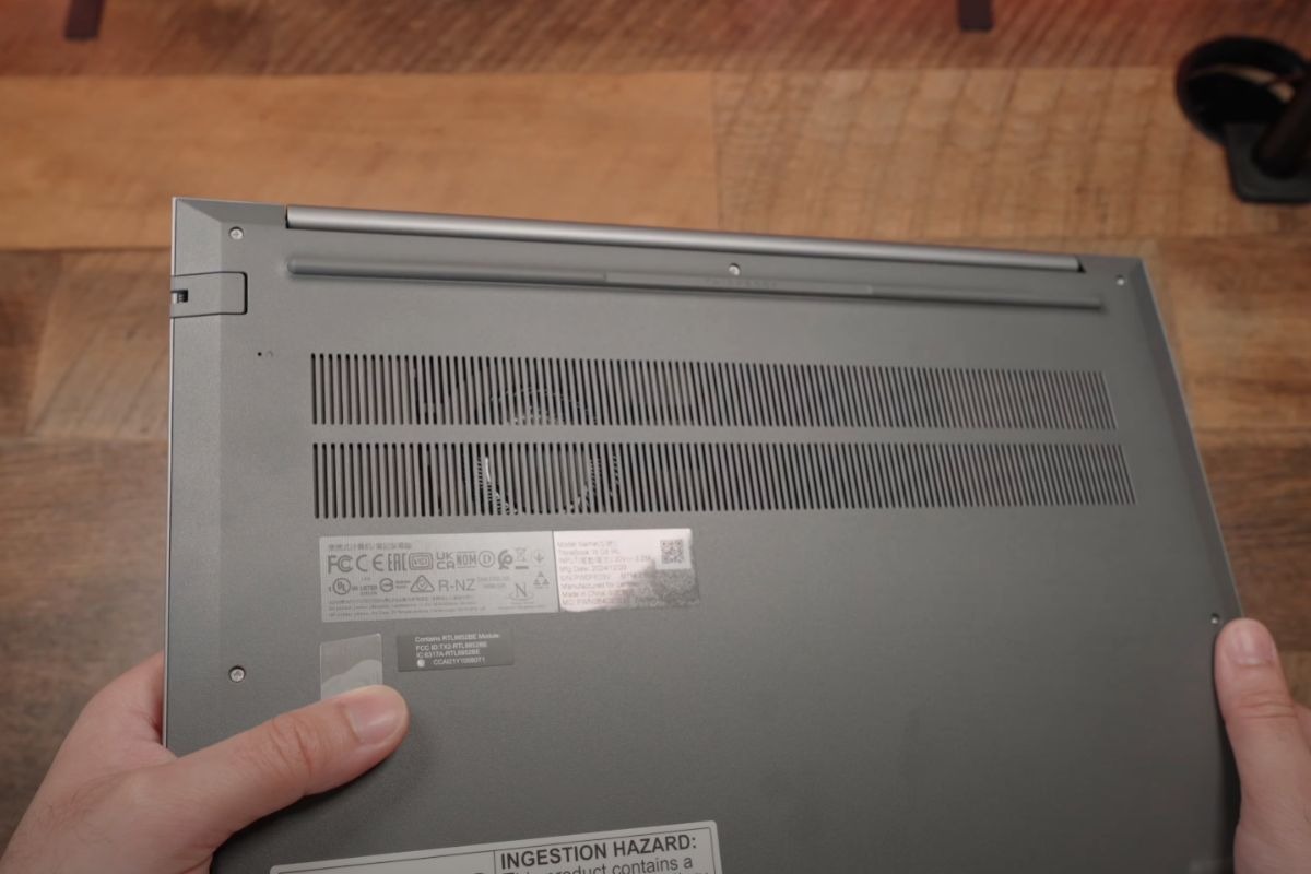 Phần đáy máy làm từ nhựa cao cấp, tích hợp hai dải lưới tản nhiệt lớn được bố trí hợp lý để hỗ trợ thoát nhiệt hiệu quả. Cạnh dưới còn có hai dải loa giúp âm thanh phát ra rõ ràng hơn khi đặt trên mặt bàn. Trong quá trình sử dụng, máy có thể hơi ấm lên ở khu vực màn hình khi chạy tác vụ nặng nhưng nhìn chung vẫn giữ được sự ổn định và mát mẻ tương đối.