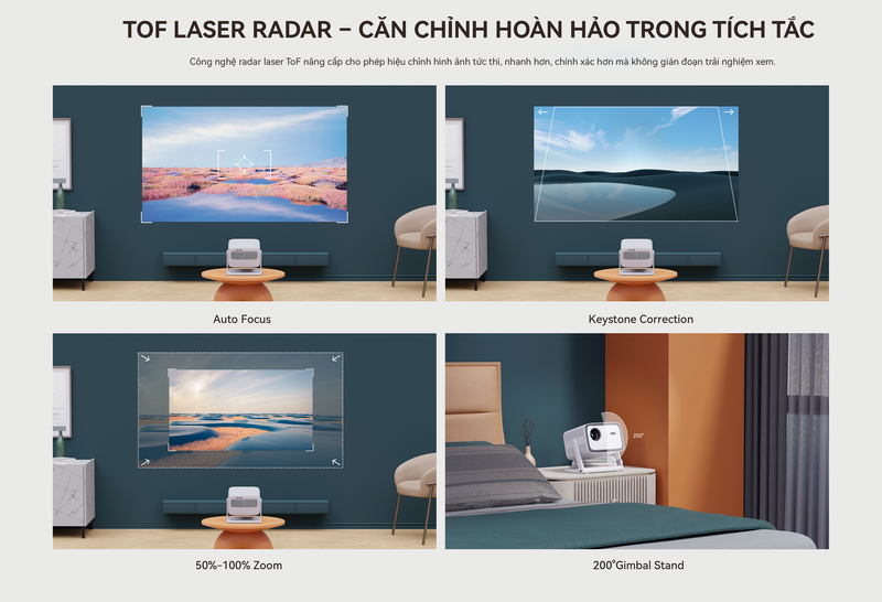 Wanbo Vali 1 được trang bị công nghệ TOF Laser Radar, cho phép hiệu chỉnh hình ảnh nhanh chóng và chính xác. Tính năng lấy nét tự động, chỉnh sửa Keystone và thu phóng từ 50% đến 100% giúp người dùng dễ dàng điều chỉnh mà không làm gián đoạn trải nghiệm. Qua đó, khung hình luôn đạt độ cân đối và sắc nét chỉ trong tích tắc.