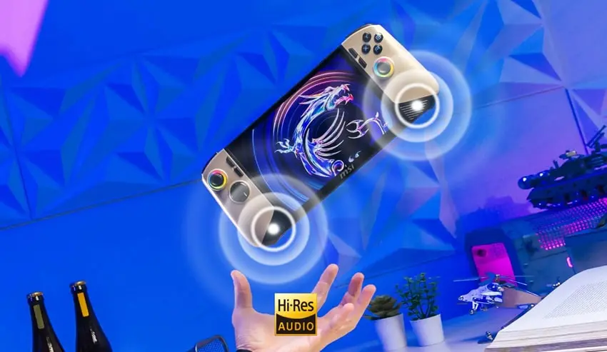- Về âm thanh, MSI Claw sở hữu hai loa stereo 2W chuẩn Hi-Res Audio, mang đến chất âm chi tiết, dải tần cân bằng và âm lượng lớn vừa đủ khi chơi game hay xem phim. Công nghệ âm thanh vòm ảo 7.1 hỗ trợ định vị hướng trong game, giúp người chơi xác định rõ vị trí bước chân hoặc tiếng súng, đặc biệt hữu ích trong các tựa game FPS. Khi sử dụng tai nghe cao cấp, người dùng có thể tận hưởng trải nghiệm âm thanh chất lượng studio, phục vụ tốt cả chơi game lẫn nghe nhạc chuyên sâu.
